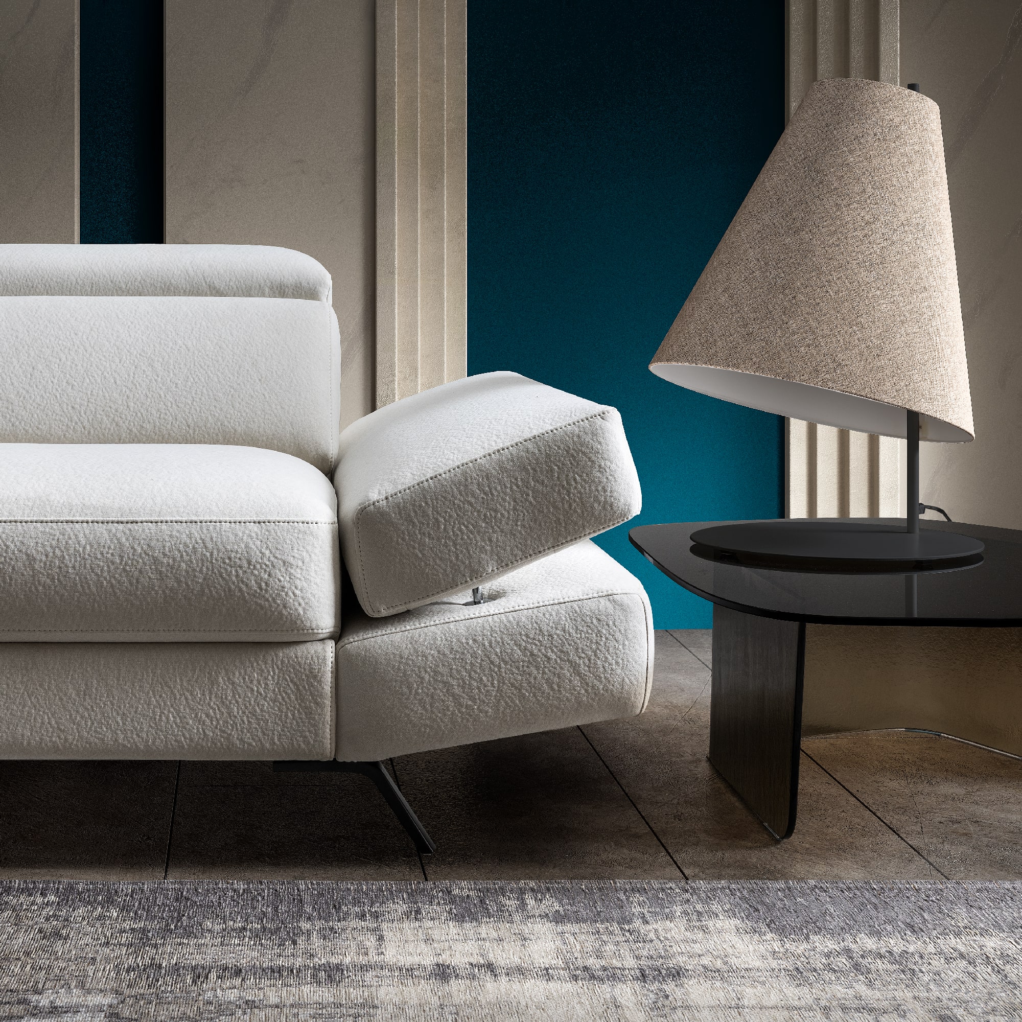 La fonctionnalité de Gustavo s'exprime à travers des détails intelligents et discrets : les appuie-tête et les accoudoirs inclinables offrent une expérience de détente personnalisée, tandis que les sièges coulissants manuels permettent d'agrandir naturellement l'espace de détente.