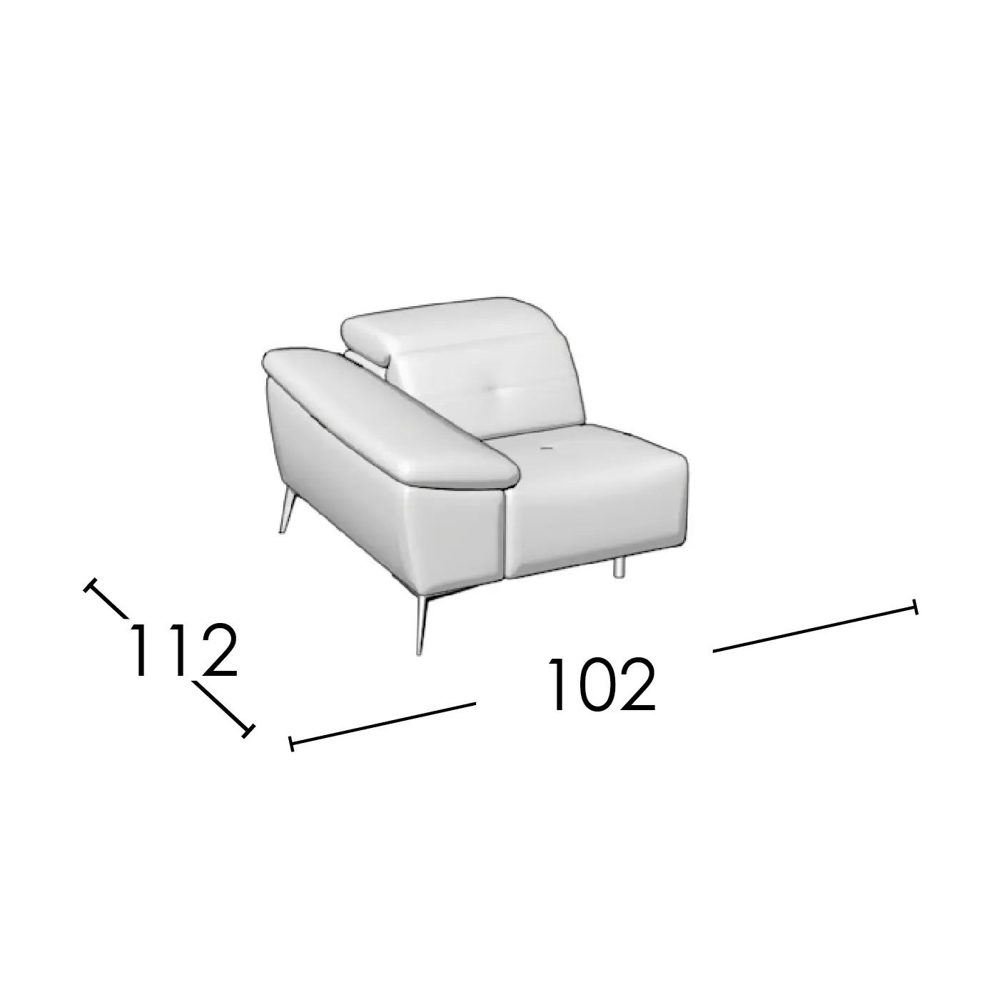 L'accoudoir se caractérise par une structure large et robuste, avec un surbras bas et incliné qui ajoute une touche de modernité au design. Cette structure est soutenue par des pieds élancés de couleur titane fumé, qui donnent de la légèreté à l'ensemble.